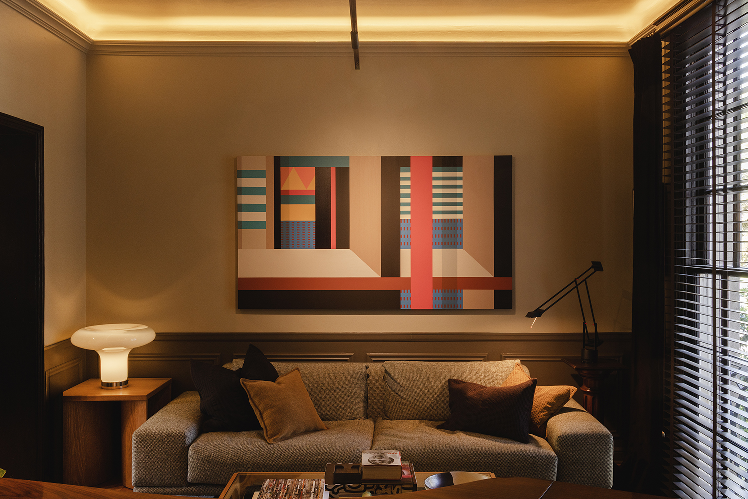 La combinación de piezas contemporáneas con elementos de mayor peso material introduce profundidad sin perder claridad. El arte y los objetos aparecen como puntos de tensión controlada, ordenando el espacio con sutileza.