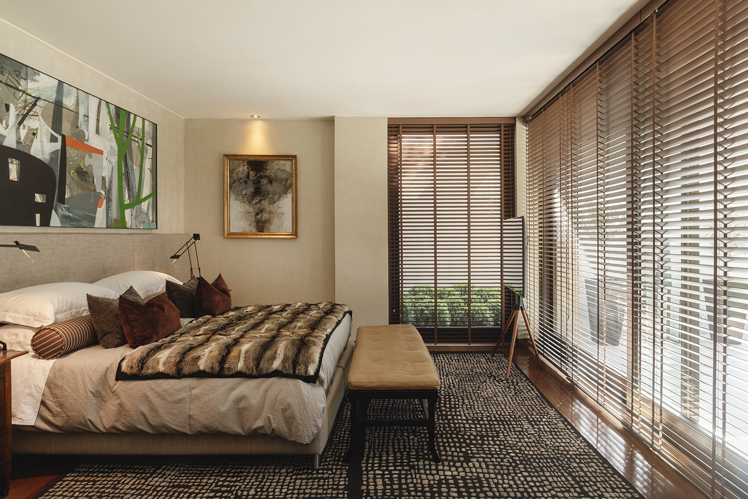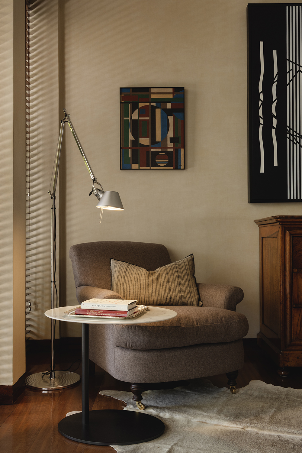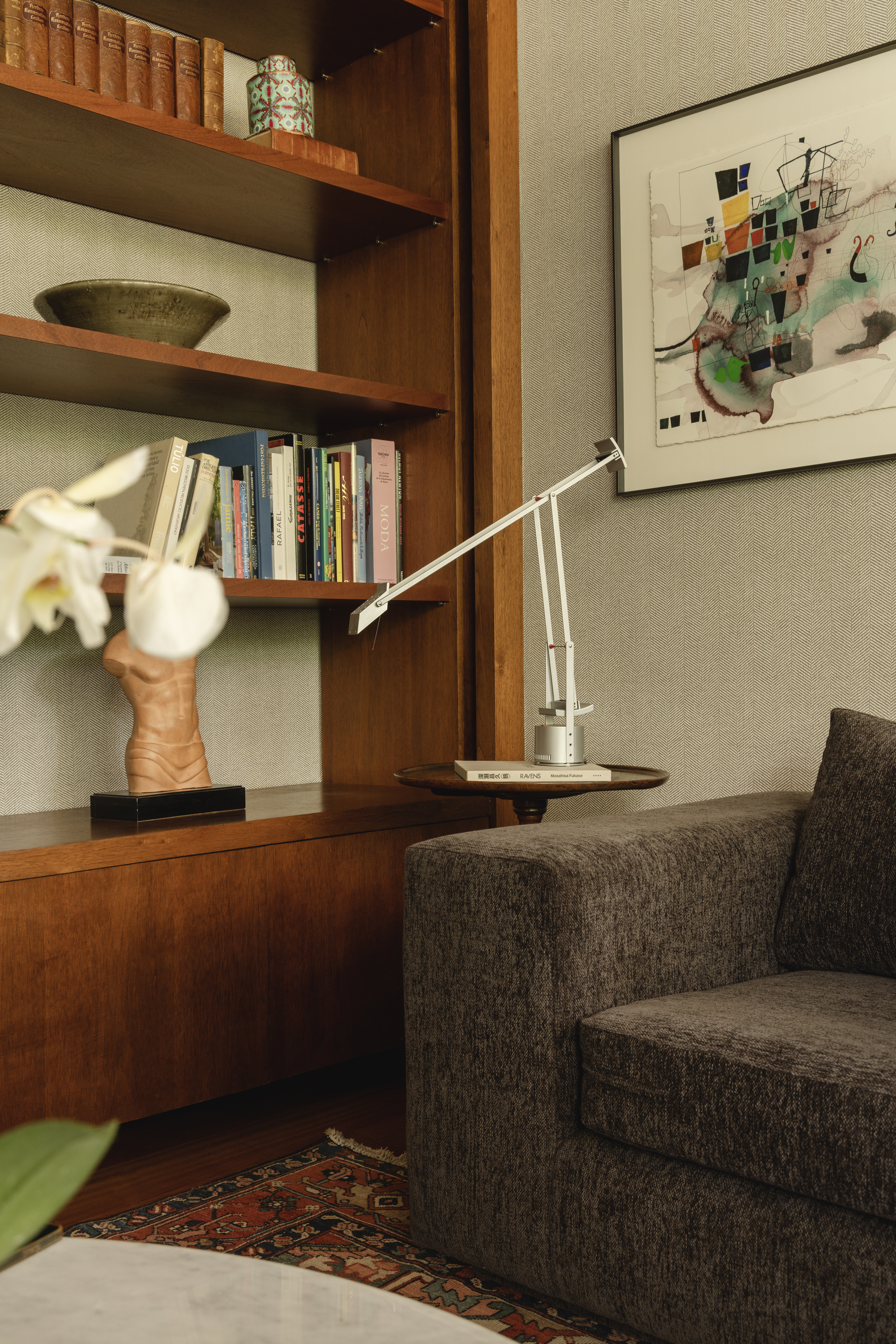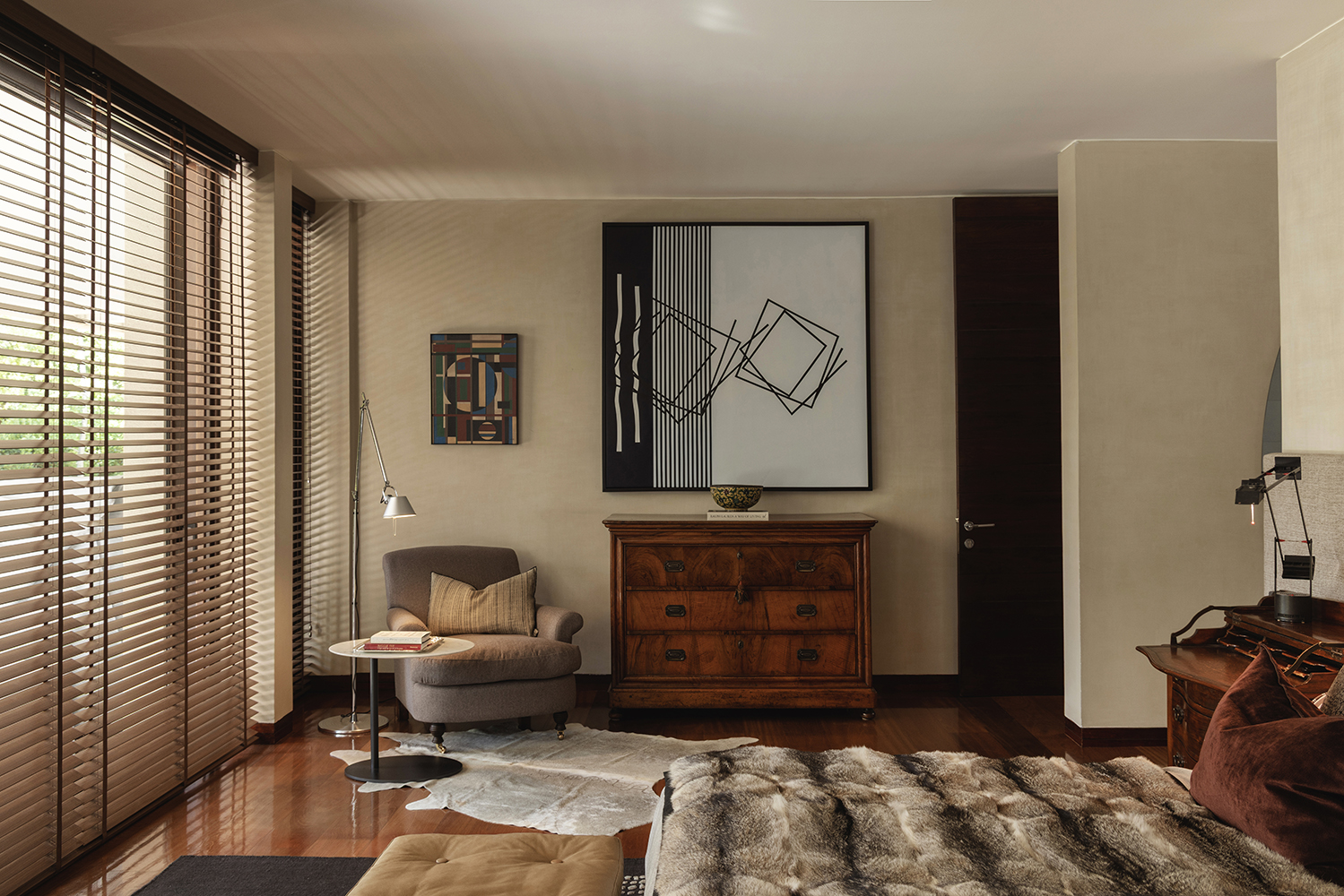 El proyecto combina piezas contemporáneas con mobiliario de mayor carácter, logrando una composición atemporal y precisa. La materialidad —maderas oscuras, textiles nobles y una paleta neutra— permite que la luz modele el espacio con sutileza a lo largo del día.